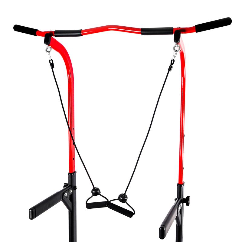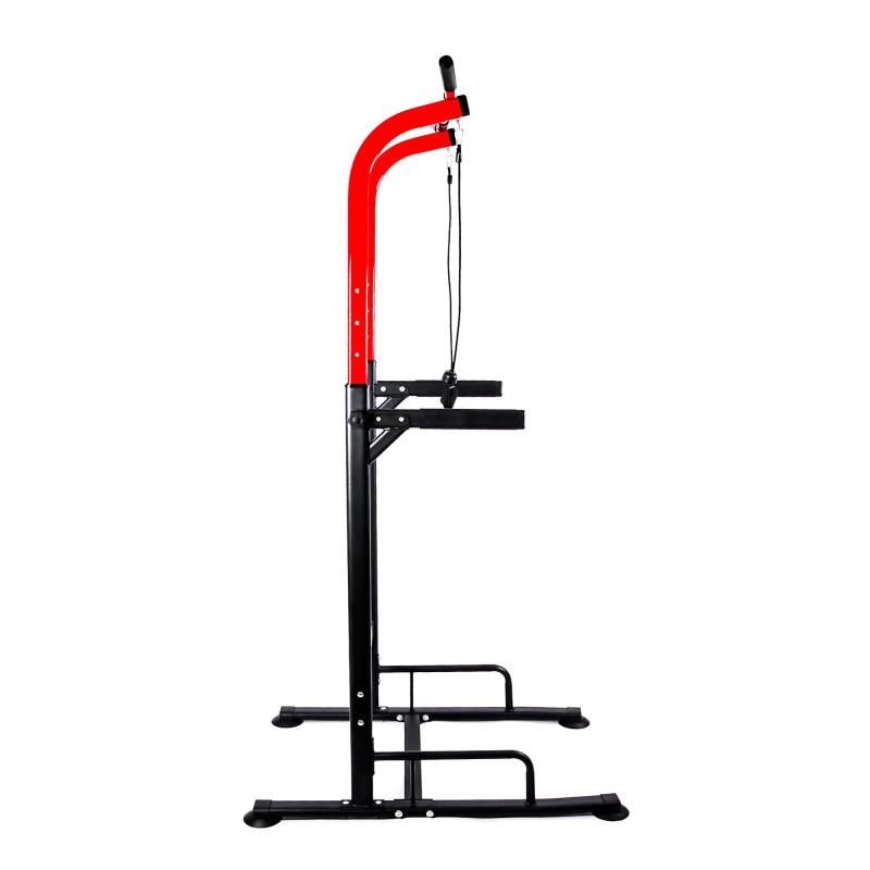 Voľne stojaca multifunkčná hrazda Aga s bradlami predstavuje efektívne riešenie na posilňovanie celého tela vlastnou váhou.\n\nDisponuje hornou hrazdou s protisklzovým pogumovaným povrchom, ktorá umožňuje vykonávať príťahy a ďalšie cviky zamerané na svaly chrbta, brucha a paží.\n\nBradlá rozširujú možnosti tréningu, predovšetkým na posilnenie brušného svalstva. Súčasťou sú aj dva expandéry, ktoré rozširujú škálu cvikov a pomáhajú tvarovať svaly ramien, hrudníka a chrbta.\n\nSpodné madlá slúžia na vykonávanie kľukov, ktoré efektívne posilňujú prsný svalstvo a triceps.\n\nPevná oceľová konštrukcia s práškovým nástrekom zaručuje stabilitu a nosnosť až 150 kg, čo umožňuje bezpečný a komfortný tréning.\n\nVýšku zariadenia je možné ľahko upraviť v rozmedzí 174-221 cm pomocou regulačných skrutiek na ráme, takže si ju prispôsobíte podľa svojej výšky a tréningových potrieb.\n\nŠpecifikácia multifunkčnej hrazdy s expandérmi Aga:\n\n