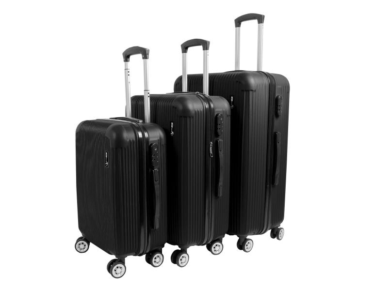 Sada tří černých cestovních kufrů z odolného ABS materiálu s 360° otočnými kolečky, kódovým zámkem a praktickými rukojeťmi pro snadnou manipulaci. Zobrazit celý popis