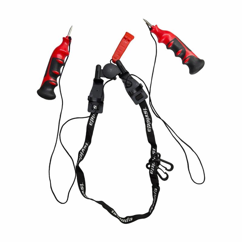 Bezpečnostní ledovcové bodce s ergonomickou rukojetí a ostrými nerezovými hroty pro rychlé vyproštění z ledu. Součástí je i praktická píšťalka.