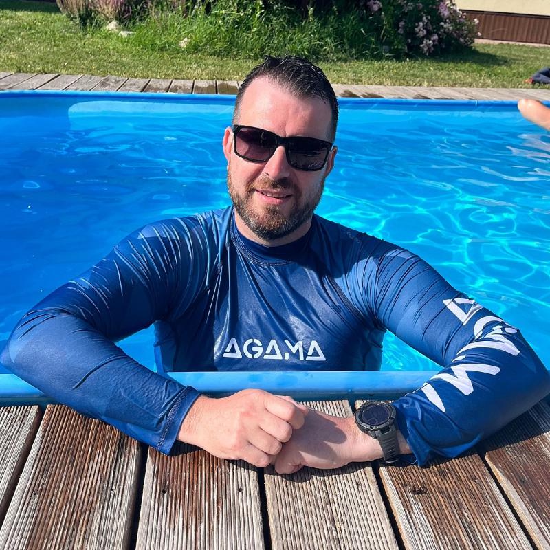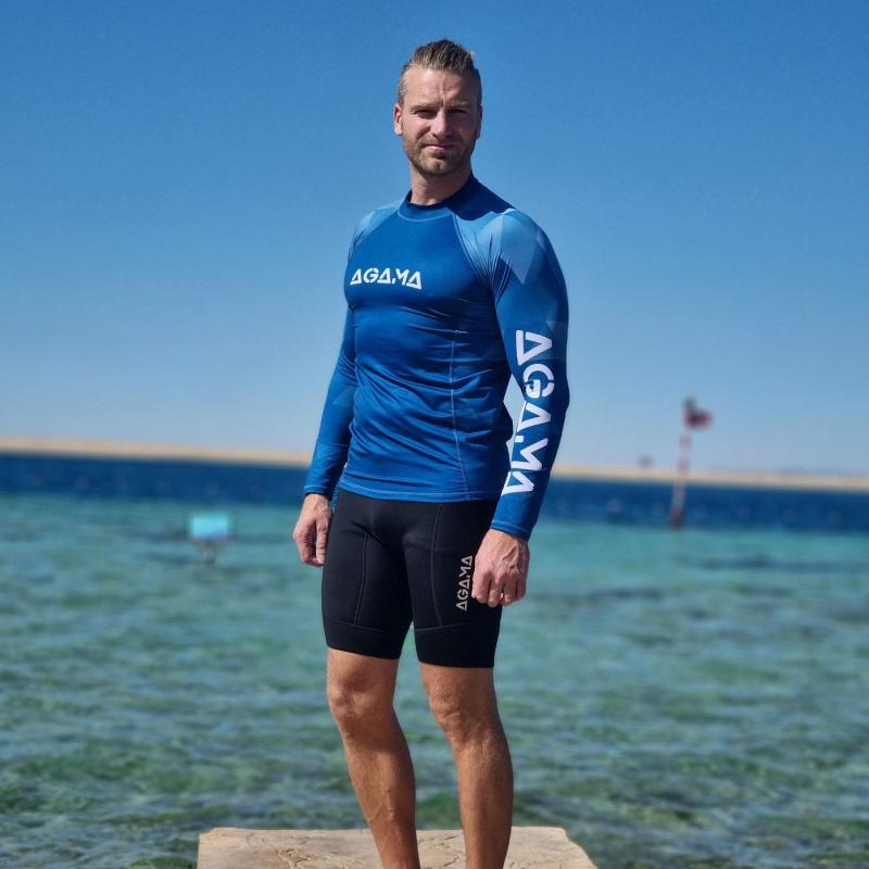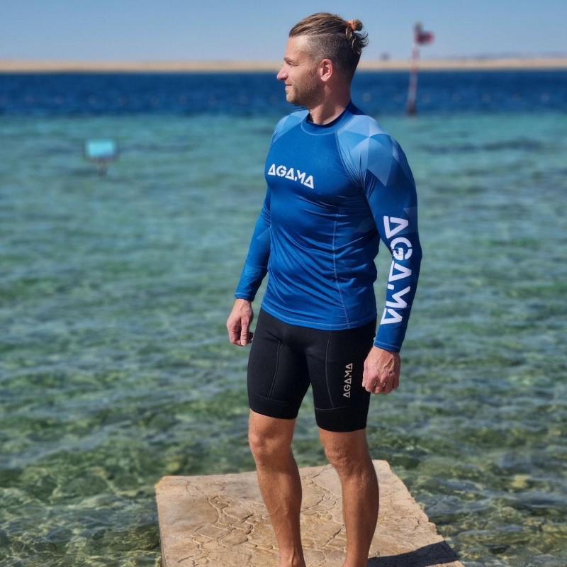 Pánské rashguard tričko Agama BLUE může sloužit též jako spodní vrstva pod běžný neoprenový oblek, či jako ochrana před sluncem nebo prochladnutím při šnorchlování.
