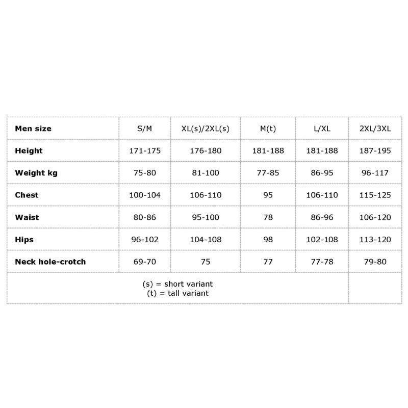 K výrobě pánského neoprenového obleku byl použit 3 mm široký superstretchový neopren. Pro oblast podpaží a podkolenní byl pak použit 2,5 mm neopren, díky čemuž vás oblek nebude omezovat v pohybu. Proti oděru, byl na oblast kolenou použit speciální protioděrový materiál. Všechny švy na potápěčském obleku pro muže jsou lepené a šité.