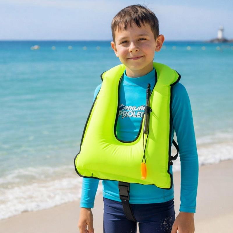 Ľahká a ľahko nafukovacia vesta pre deti od 7 rokov s reflexnými farbami a bezpečnostnou píšťalkou pre lepšiu viditeľnosť a ochranu pri šnorchlovaní. zobraziť celý popis
