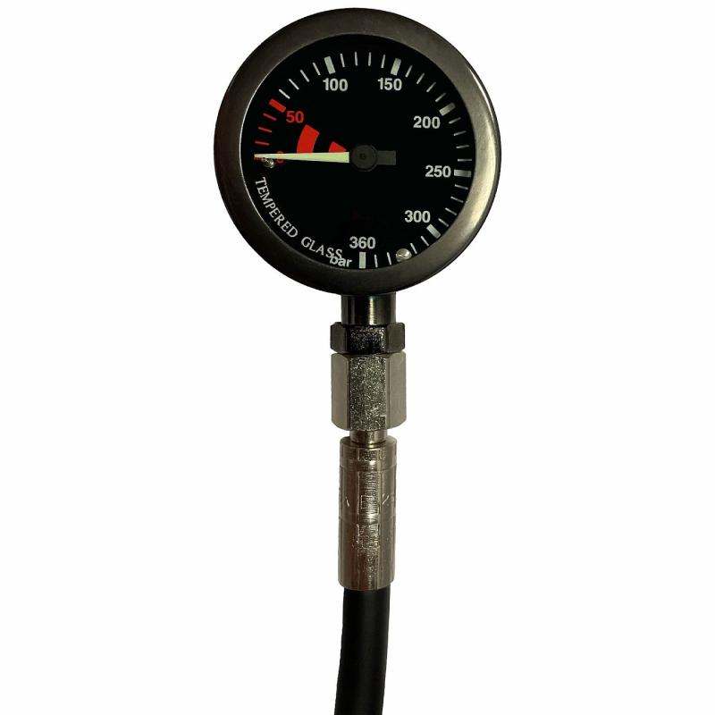 Průměr hlavy měřícího přístroje na potápění je 52 mm. Provozní tlak manometru je 300 barů, ukazatel do 360 barů.