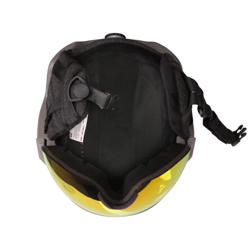 Lyžařská helma poskytuje spolehlivou ochranu hlavy i očí díky pevné konstrukci a protislunečnímu štítu vhodnému pro jasné až polojasné počasí.Tato lyžařská helma je navržena tak, aby nabízela bezpečnou a pohodlnou ochranu při zimních sportech, ať už lyžujete nebo jezdíte na snowboardu. Díky pevnému zapínání se helma pevně přizpůsobí tvaru hlavy, což zajišťuje stabilitu a bezpečnost během pohybu. Poutko pod bradou nejenže zabraňuje smeknutí helmy, ale také pomáhá udržet brýle na svém místě, takže se nemusíte obávat jejich sklouznutí.