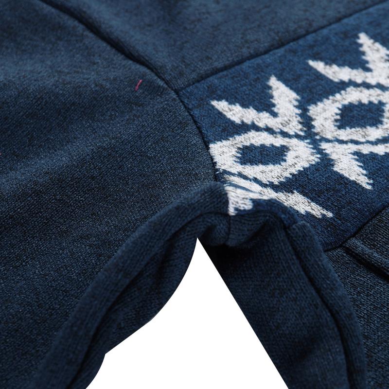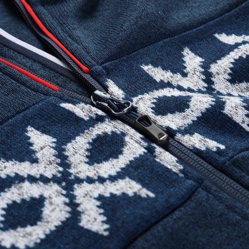 Materiál je zo 100 % polyesteru, ktorý je hrejivý, štruktúrovaný, vypletaný, a navyše celopotlačený melírovaným vzorom, ktorý dodáva svetru atraktívny vzhľad bez zbytočných ozdôb.