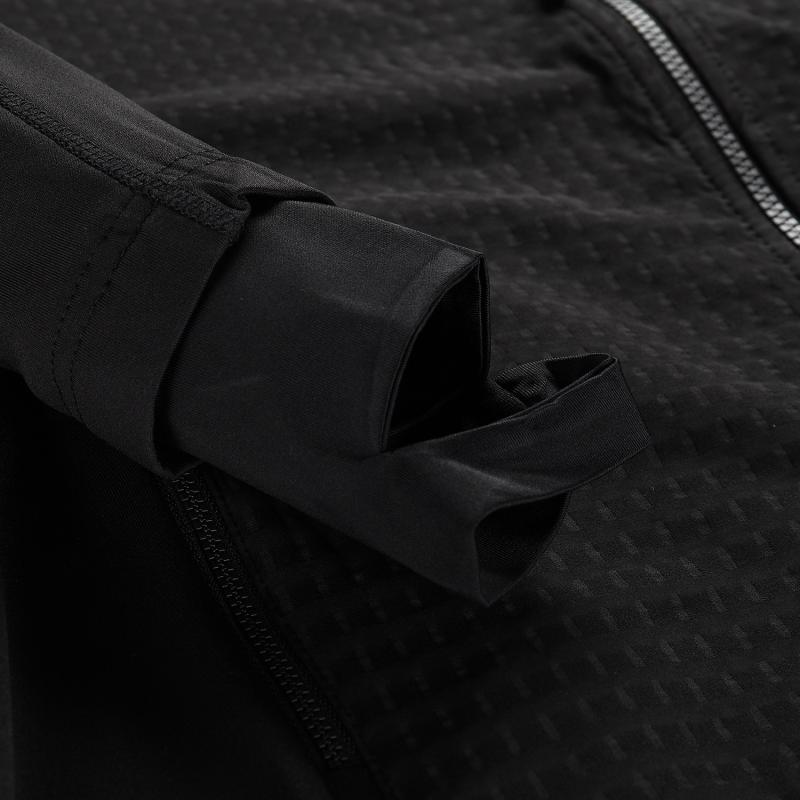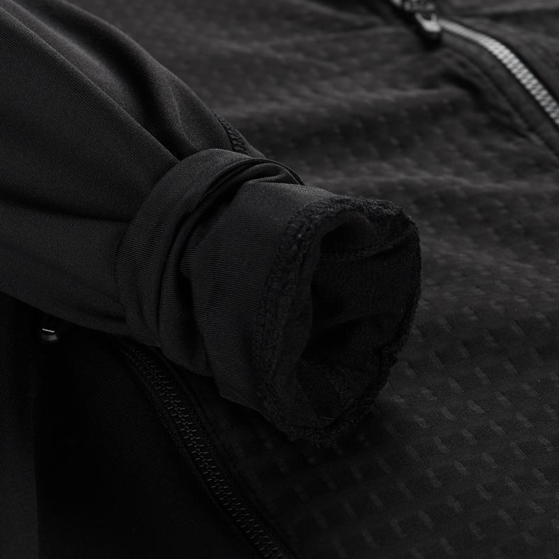 Tato mikina je vyrobena z materiálu, který kombinuje větruodolnost, prodyšnost a rychlé schnutí s vysokou pružností, což zajišťuje pohodlí a hřejivý komfort při různých aktivitách. Kontrastní embosovaný materiál dodává moderní vzhled a spolu s přiléhavým střihem a plochými švy přispívá k pohodlnému pohybu bez otlaků.