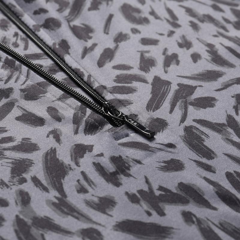 Celopotlačený vzor dodáva moderný vzhľad, zatiaľ čo priliehavý strih s plochými švami a krátkym kontrastným zipsom na stojáčiku prispieva k pohodliu a jednoduchému obliehaniu. Reflexná potlač zvyšuje viditeľnosť a bezpečnosť pri pohybe vonku za šera alebo tmy.