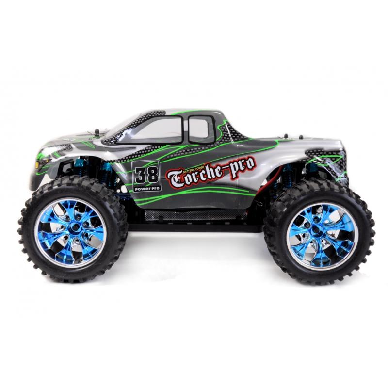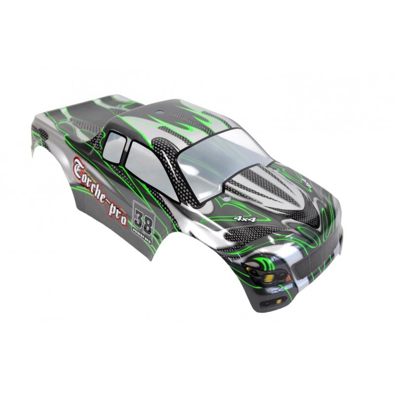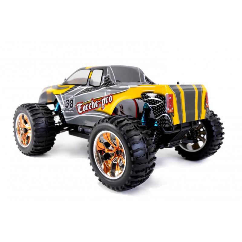 TORCHE PRO MONSTER TRUCK Brushless 4WD 1:10 není žádné tintítko ani ořezávátko. Velikost přesahující 400 mm je toho jasným důkazem, stejně jako možná maximální rychlost 65+ km/h. Jedná se o model pro zkušenější řidiče, ale díky jednoduchému a intuitivnímu ovládání je vhodný i pro začátečníky. Hlavním tahákem TORCHE PRO MONSTER TRUCK Brushless je plně proporcionální jízda s velmi silným brushless (bezkartáčovým) motorem typu 3300KV, který pohání všechna 4 kola. Tomu dopomáhají ocelové převody i ocelové diferenciály vpředu i vzadu. To ale zdaleka není vše, co model nabízí, neméně zajímavé je plně nastavitelný podvozek s 8 olejovými ALU tlumiči, které v kombinaci s kovovými kuličkovými ložisky a super elastickými pneumatikami zvládnou odpružit jakoukoliv nerovnost a zajistit bezkonkurenční přilnavost i v těch nejvyšších rychlostech. O plynulé zatáčení se stará servo SP6001 se silou 6 kg a dobou polohování 0,18 s. Výbornou výbavu završuje karoserie z Lexanu, díky kterému se nemusíte bát občasných kolizí. Model je dodáván v edici RTR a stačí jen dokoupit baterie do ovladače, nabít a vyrazit na cestu.