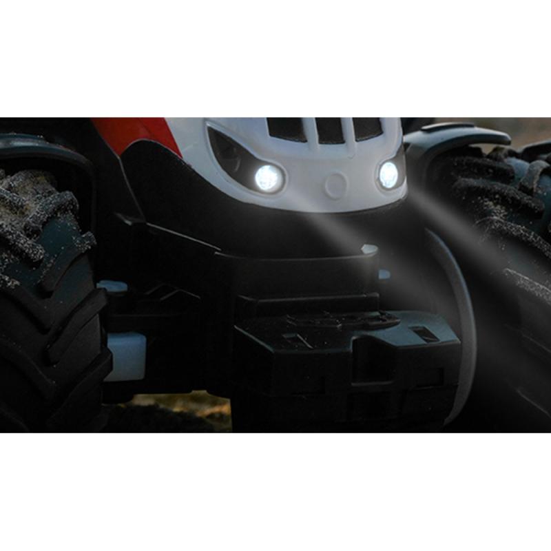 Traktor svieti a vydáva realistické zvuky, jazdí vpred, vzad, doľava, doprava. Poháňaný je na veľké zadné kolesá, ktoré sú vybavené mäkkými pneumatikami z gumy s hlbokým vzorom. Kabína vodiča je doladená do posledného detailu a kompletne uzavretá. DEMO funkcia predvedie bez vášho zásahu pohyby traktora.