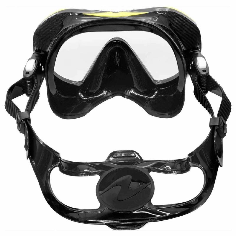Přezky na této potápěčské masce jsou přímo připojeny k silikonu a vybaveny systémem rychlého nastavování pásku.