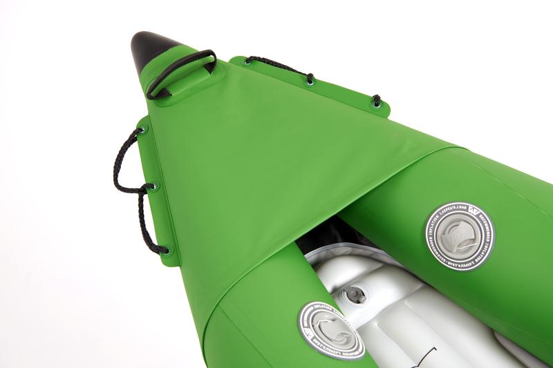 Příď a záď kajaku jsou vybaveny ochranou vrstvou V-cone Protection, která zabraňuje poškození materiálu při kontaktu s překážkami ve vodě. Díky Splash Guard na přídi je navíc minimalizován vstup stříkající vody do kajaku, což zvyšuje komfort během plavby.