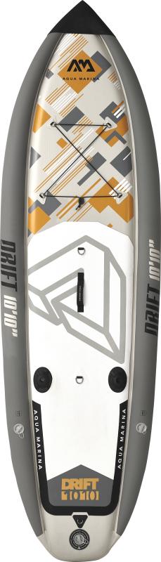 AQUA MARINA Drift je unikátny paddleboard, ktorý ocenia predovšetkým zapálení rybári. Plavák je vyrobený pevnú drop-stitch technológiou a je vybavený extra bočnicami pre vysokú stabilitu. Paddleboard ďalej disponuje stojanmi na rybársky prút, leashom, skladacím pádlom, odnímateľnou plavákom a držiakom na pádlo. V prednej časti paluby je umiestnené pružné lano na prichytenie osobných vecí alebo nákladu na dlhšie cesty. Povrch plaváka je potiahnutý protisklzovou EVA nášľapnou vrstvou, ktorá zaručuje perfektný grip. Tento plavák je kompatibilný s prenosným chladiacim boxom od rovnakého výrobcu. Paddleboardy AQUA MARINA majú vnútornú hubovitú štruktúru, ktorá po nafúknutí na tlak 15-18 PSI perfektne drží tvar a je veľmi tuhý. Odporúčaný tlak výrobcom je 15 PSI, maximum potom 18 PSI. Bočnice je možné nafúknuť do tlaku 3 PSI.