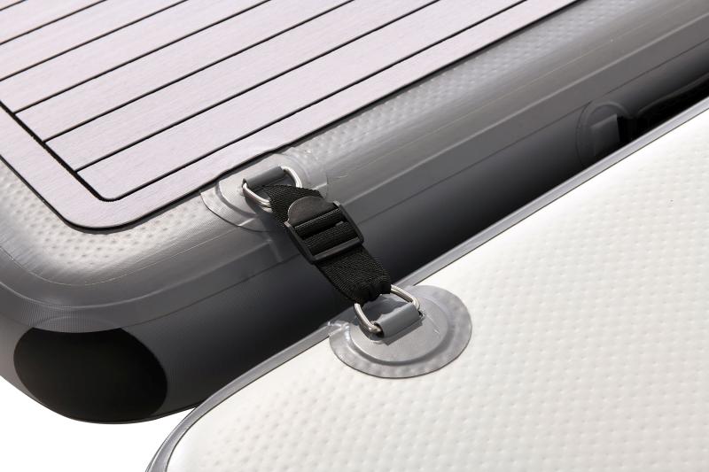 Molo bezpečně unese 3-4 pasažéry a v případě potřeby je možné spojit více platforem k sobě. Molo má protiskluzovou nášlapnou vrstvu z EVA pěny, vysoce odolné, vyztužené bočnice, UV ochranu pro extra výdrž, postranní madla a integrované D-ringy pro možnost variabilního připnutí.