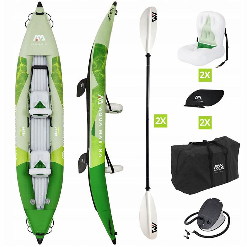 Aqua Marina predstavuje inovovaný nafukovací kajak BETTA na vodu. Kajak 412 je stále veľmi skladná loď vhodná pre 2 osoby. Nafukovacia loď je navrhnutá pre zvýšenú odolnosť. Jeho prednosťou je najmä jednoduchá inštalácia, skladovanie i používanie. Nafukovací kajak na vodu je vhodný najmä na veľké jazerá a pokojnejšie toky. Vďaka jeho nízkej hmotnosti oceníte jeho jednoduchú ovládateľnosť. Vďaka jeho vlastnostiam je vhodná najmä pre začiatočníkov a pokročilých kajakárov.