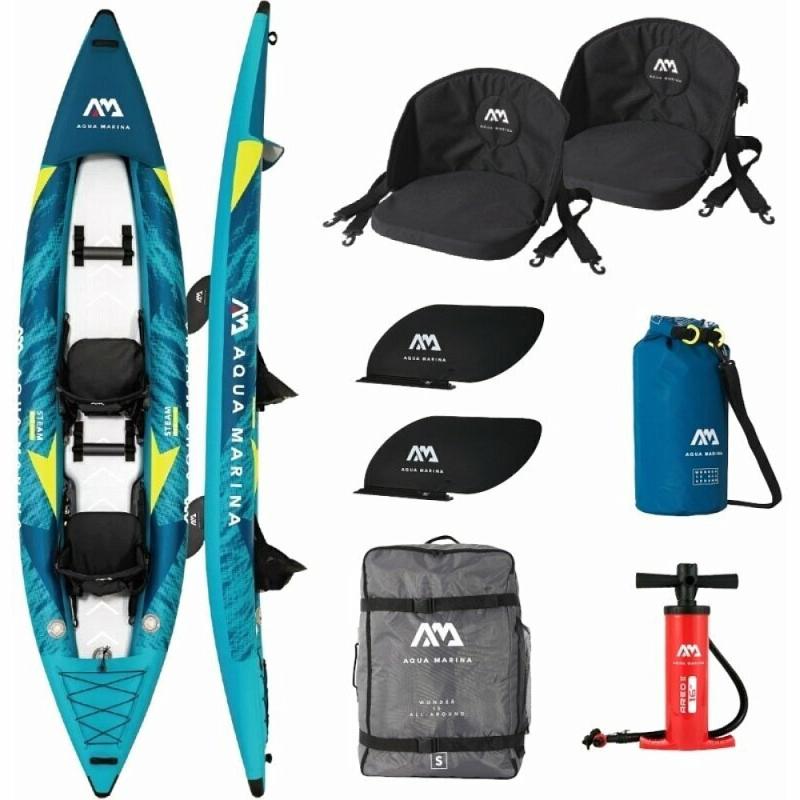 Dvoumístný kajak Aqua Marina STEAM 412 je díky své pevné DWF podlaze vybavené "drop-stitch" technologií velmi pevný, což lze vidět na jeho jízdních vlastnostech. Té napomáhají i odtokové kanálky, kterými může nastříkaná voda volně vytéct ven. Nemusíte se tedy vůbec obávat špatné ovladatelnosti z důvodu vody v kajaku. Pohodlná nafukovací nastavitelná sedátka oceníte zejména při delších výletech.