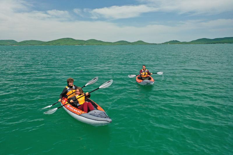 Nafukovací kajak je potiahnutý odolnou škrupinovou tkaninou AQUASHELL™ so špeciálnou vodoodpudivou úpravou a UV ochranou.