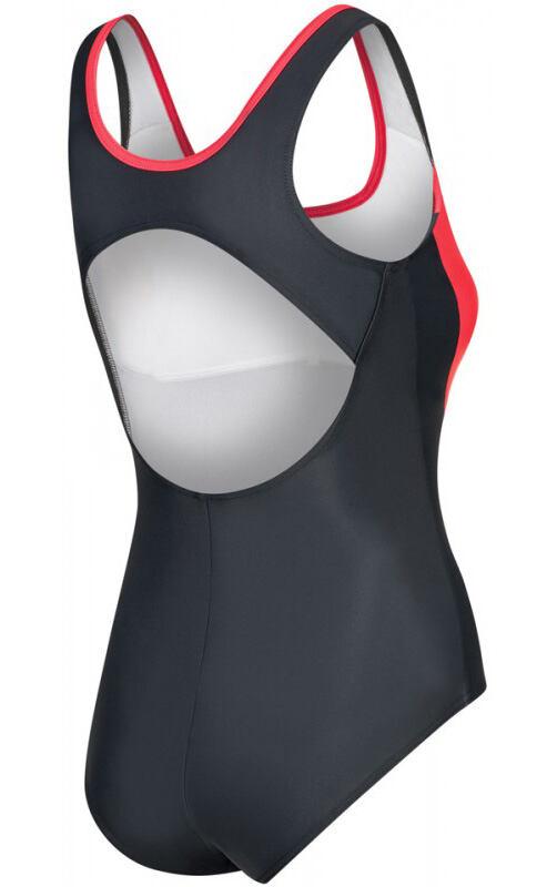 Dámské jednodílné sportovní plavky jsou navrženy tak, aby kombinovaly funkčnost s pohodlím a moderním vzhledem. Mají vertikální lemování a stylové barevné panely, které dodávají plavkám zajímavý design. Střední nohavička a široká ramínka zajišťují pohodlné nošení a dostatečnou podporu během plavání. Záda jsou řešena zpola krytým střihem, což přispívá k lepší stabilitě a komfortu.