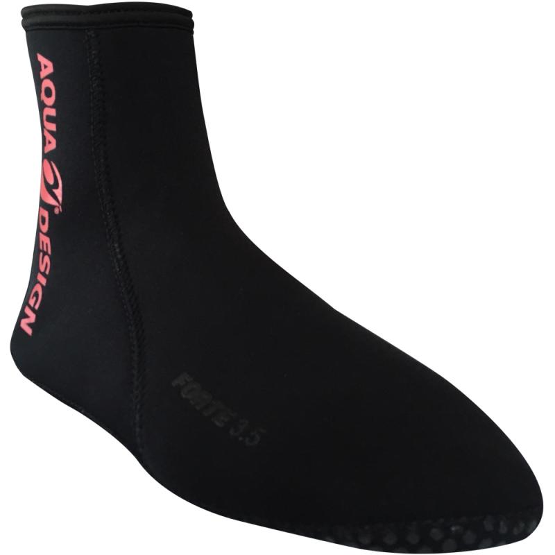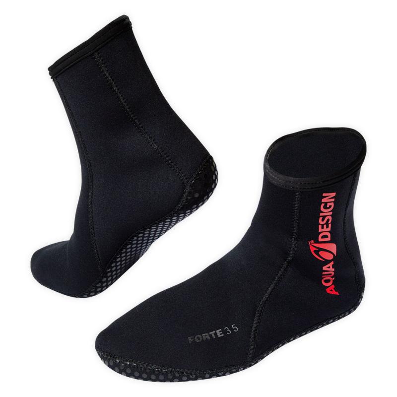 Neoprenové ponožky značky Aquadesign představují spolehlivou ochranu nohou při vodních aktivitách. Jsou vyrobené z kvalitního neoprenu o síle 3,5 mm, což zajišťuje dostatečnou tepelnou izolaci i v chladnějších vodách. Konstrukce je tvořena třemi panely, které jsou spojeny lepenými švy, což výrazně zvyšuje odolnost proti pronikání vody a prodlužuje životnost výrobku.