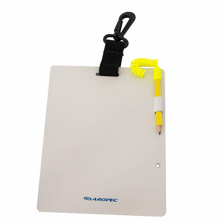 Potápěčská tabulka na ruku pro psaní vzazů je skvělá, jelikož lze zavěsit i na karabinu. Součástí balení je i psací tužka.