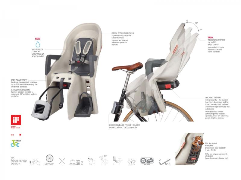 Produkt bol testovaný podľa normy EN14344, ktorá stanovuje bezpečnostné požiadavky pre detské cyklosedačky. Odporúčame odbornú montáž, aby bola zabezpečená maximálna bezpečnosť a správne upevnenie.