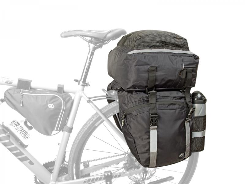 Prostorná a variabilní brašna na nosič s odnímatelnou horní částí, voděodolnou pláštěnkou a kapsou na láhev, vhodná pro cykloturistiku i vícedenní výlety.Tato prostorná a variabilní brašna na nosič nabízí objem 40 litrů, který je rozdělen do dvou částí – hlavní spodní brašny a odnímatelné horní brašny o objemu 14 litrů. Díky tvarovaným rohům se nemusíte obávat nepříjemného kopání do brašen během jízdy. Obě části mají velkou hlavní kapsu na zip, což usnadňuje organizaci věcí a jejich bezpečné uložení.