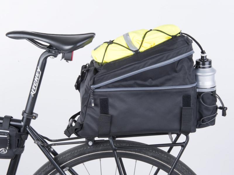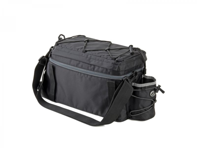 Polstrovaná taška s nastaviteľným objemom 9–14 l, vodeodolným povlakom a reflexnými prvkami, vhodná pre rôzne nosiče bicyklov. Zobrazit celý popis