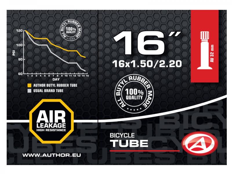 Duša AUTHOR 16x1.50-2.20 je vyrobená zo 100% butylovej gumy, ktorá zabezpečuje veľmi nízku priepustnosť plynov. Vďaka tomu si pneumatika udrží tlak vzduchu po dlhšiu dobu v porovnaní s dušami zo syntetickej gumy, čo znamená menej časté nafukovanie a pohodlnejšiu jazdu.