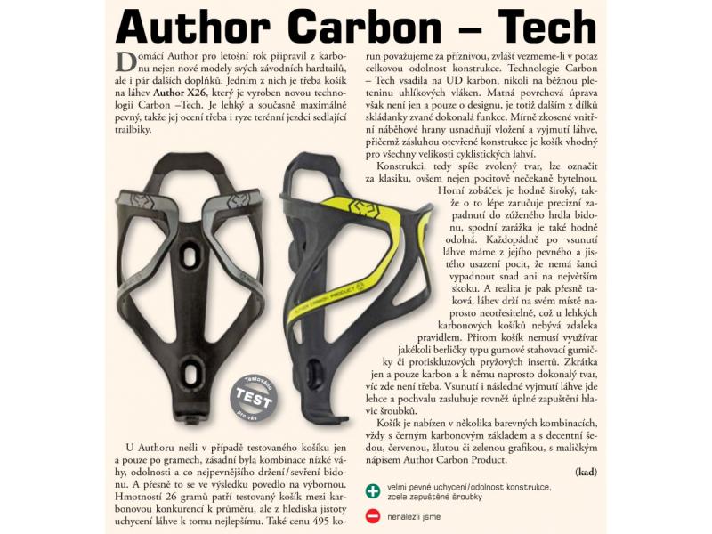 Košík na láhev AUTHOR X26 je vyroben novou Carbon–Tech technologií, která zajišťuje jeho nízkou hmotnost a vysokou pevnost. Díky tvarovaným vnitřním hranám se láhev snadno vkládá a vyjímá, což ocení každý cyklista při rychlých zastávkách. Otevřená konstrukce umožňuje použití s různými velikostmi cyklistických lahví, takže není potřeba vybírat speciální typ.