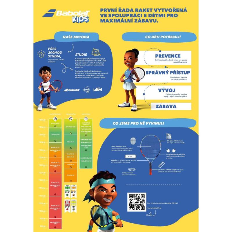 Dětská raketa Babolat B Fly 19 je navržena pro začínající hráčky s výškou postavy mezi 95 a 110 cm, což zaručuje pohodlné a efektivní používání během prvních tenisových lekcí.