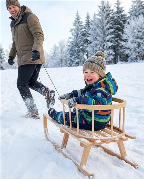 Dětské dřevěné sáňky s opěradlem a šňůrou z kvalitního bukového dřeva (tvrdé dřevo odolné proti poškození).