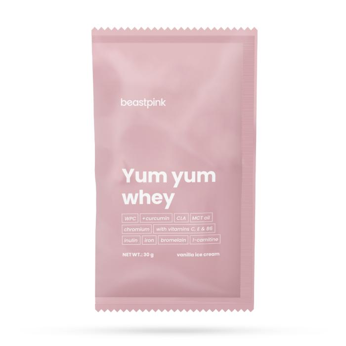 Vzorek proteinu Yum Yum Whey je jedinečný protein pro ženy v podobě syrovátkového koncentrátu s vysokým obsahem bílkovin, díky kterým přispívá k růstu a udržení svalové hmoty, stejně jako k udržení zdravých kostí. Má funkční složení a lahodnou chuť, proto ho s oblibou zařazují do svého jídelníčku nejen aktivní ženy. Kromě kvalitních bílkovin v něm najdete také l-karnitin a CLA. Protein má navíc nízký obsah tuku a cukru. Ve složení nechybí ani důležité vitamíny a minerální látky, a také trávicí enzym bromelain.Pokud vás zajímají další informace o Yum Yum Whey proteinu nebo si ho chcete koupit ve větším balení, neměla by vám uniknout produktová karta Protein Yum Yum Whey 1000 g - BeastPink.
