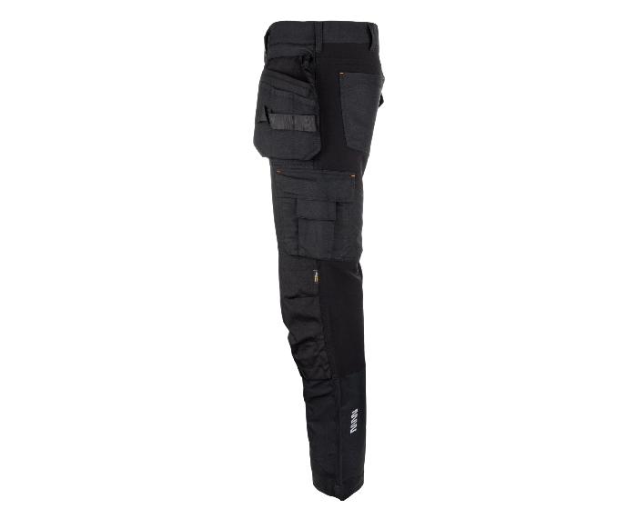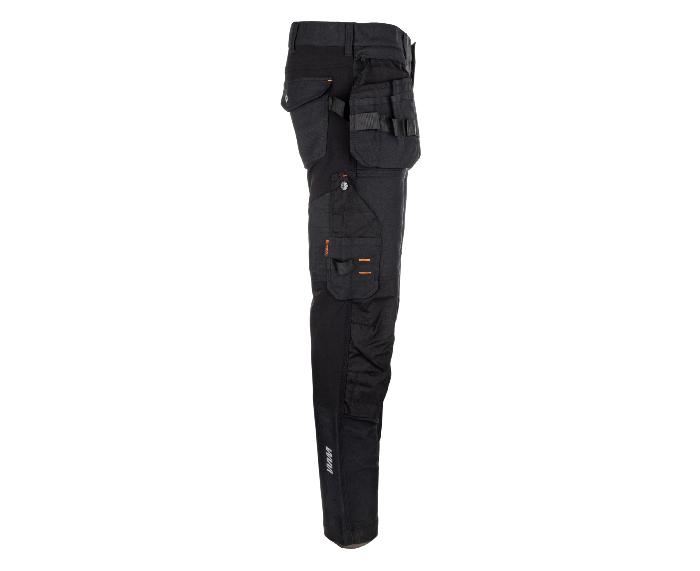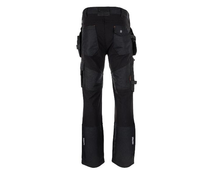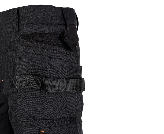 Pevné a odolné pracovní kalhoty s pružným sedem a rozkrokem, zpevněné Cordurou, s praktickými kapsami a reflexními prvky pro lepší viditelnost.