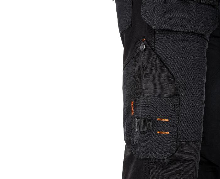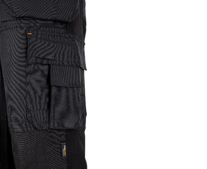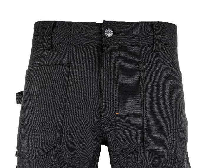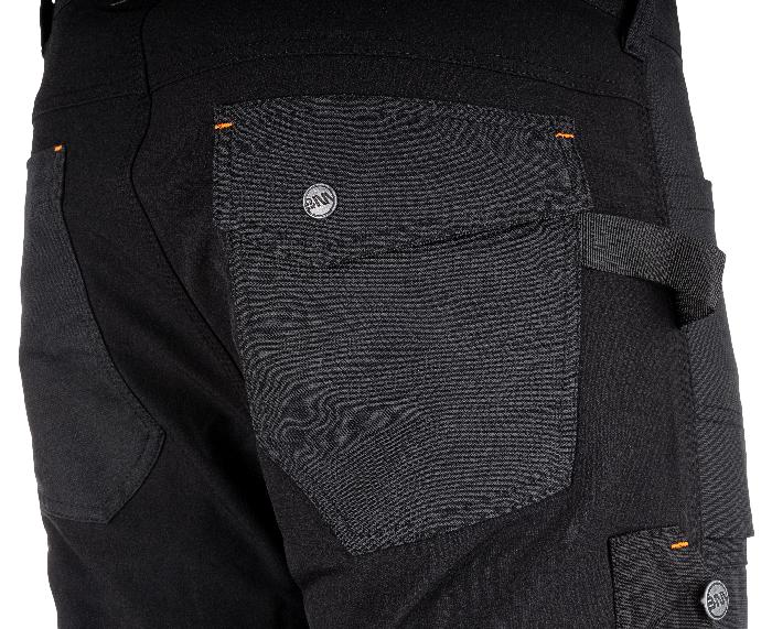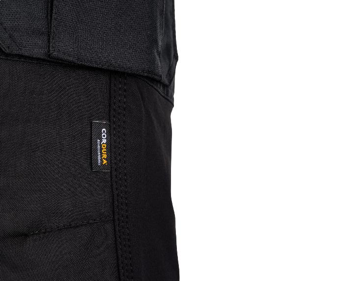 Namáhané části, zejména kolem kapes a kolen, jsou zpevněné odolnou látkou Cordura, která je známá svou výjimečnou odolností proti oděru a mechanickému poškození. Díky tomu kalhoty lépe odolávají běžnému opotřebení při práci.