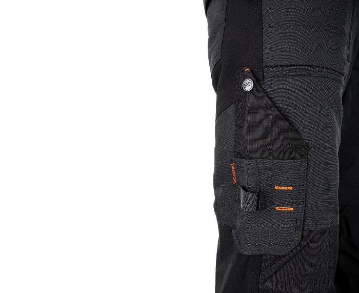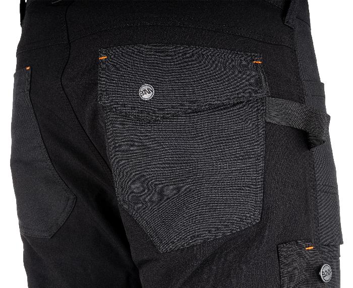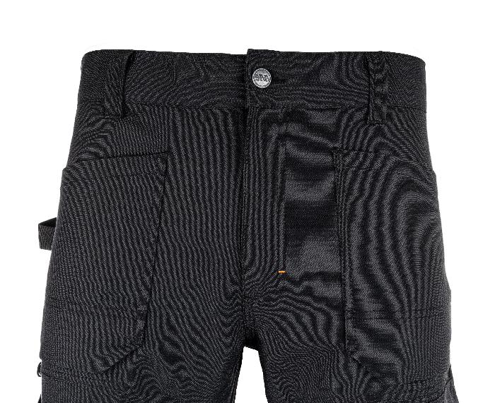 Bezpečnost zvyšují reflexní prvky na nohavicích, které zlepšují viditelnost za snížených světelných podmínek. Praktické jsou také kapsy - dvě přední otevřené, zadní otevřená i zavírací, kapsa na skládací metr a kapsa na mobilní telefon, které umožňují mít nářadí a drobnosti vždy po ruce.