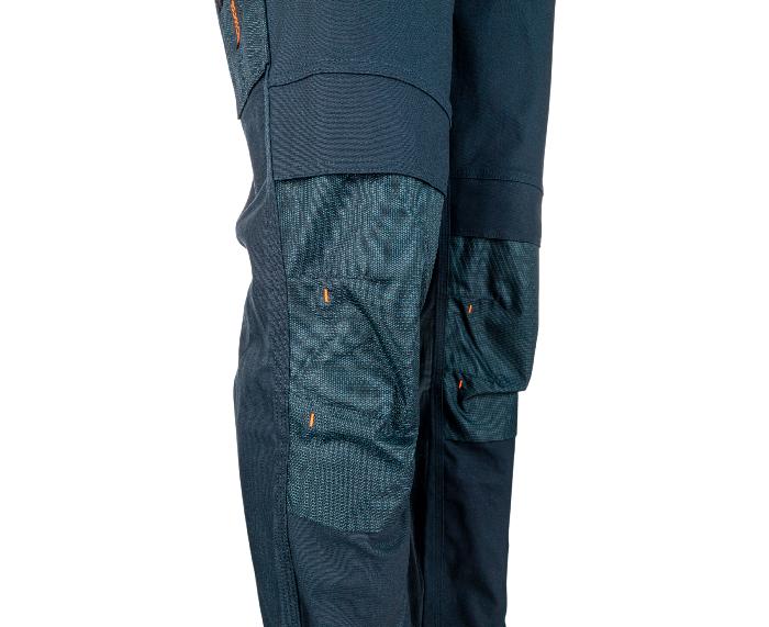 Kalhoty využívají plátnovou tkaninu typu canvas s gramáží 270 g/m², která je známá svou pevností a odolností vůči mechanickému poškození. Zesílené části z polyesterového materiálu Oxford 600D o gramáži 180 g/m² jsou umístěny na kritických místech, jako jsou kolena, což výrazně prodlužuje životnost kalhot i při častém klečení nebo práci v náročných podmínkách.