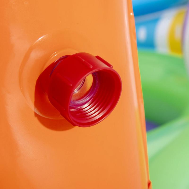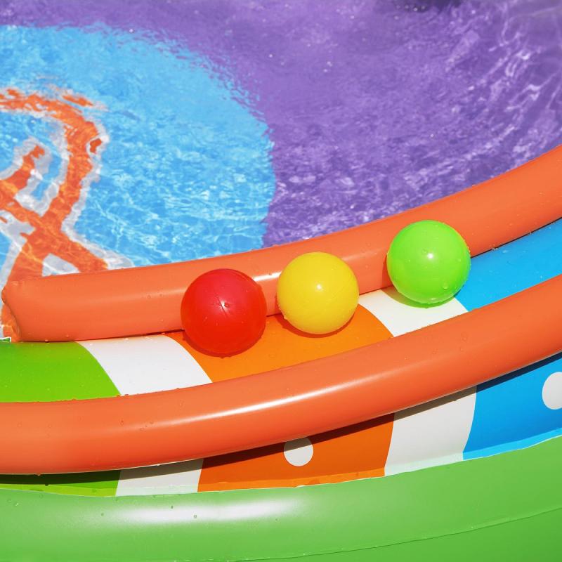 • Bazénik na vodu pre deti má pripevniteľnú nafukovaciu šmýkačku, ktorá je odnímateľná. Kedykoľvek ju teda môžete schovať. Farebná nafukovacia šmýkačka však nie je jediným doplnkom tohto detského bazénika na vodu. Súčasťou balenia sú aj loptičky, ktoré deti naučia rozpoznávať farby a spomínanú motoriku.