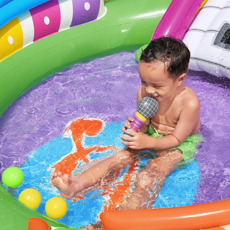 Nafukovacia šmýkačka, dva bazéniky, nafukovací mikrofón a sprcha v DISCOLANDE. To všetko malým deťom ponúka toto hracie vodné centrum. Skvelý nafukovací bazénik vhodný pre deti od 2 rokov s maximálnou nosnosťou 45 kg.• Vodné detské centrum s motívom hudby zabezpečí deťom osvieženie v letných horúcich dňoch a zároveň ich učí jemnej motorike. Detský nafukovací bazénik do záhrady môžete využiť aj ako suché hracie centrum do obývačky či do izbičky.