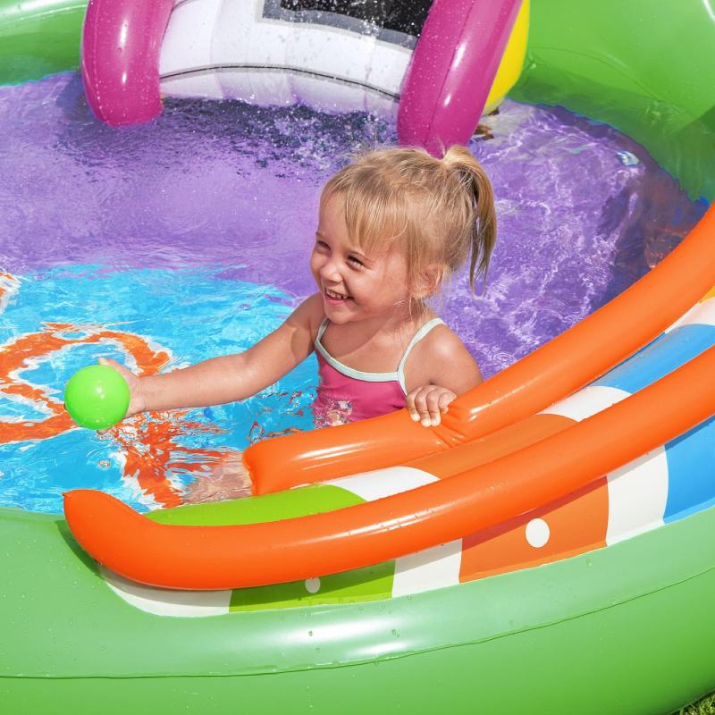 • Pre komfortnejšie sedenie a pohybovanie vašich ratolestí v záhradnom bazéniku slúži nafukovacie dno. Bazénik disponuje 2 bazénikmi, ktoré sú prepojené šmýkačkou. Menší bazénik má objem 114 l a väčší bazénik 235 l. Jeho celkové rozmery sú 295 x 190 x 137 cm.