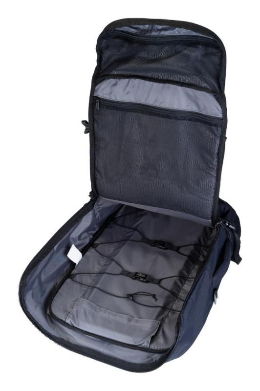 Velká přední kapsa obsahuje organizér a polstrovanou přihrádku vhodnou pro notebook o velikosti až 17" (34 cm), což umožňuje bezpečné uložení elektroniky. Menší horní kapsa na zip slouží k uschování drobností, zatímco boční kapsa je určena pro láhev na pití. Pro lepší organizaci jsou k dispozici i vnitřní kapsy a fixační popruhy uvnitř hlavní komory, které pomáhají udržet věci na svém místě.