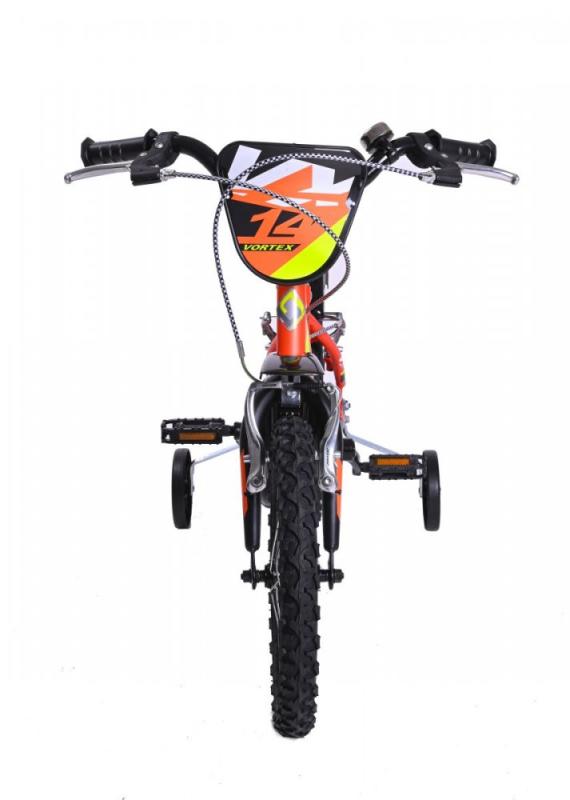 Dětské kolo Casadei Vortex 14 je nádherné chlapecké kolo typu BMX, které vykouzlí úsměv na tváři každého malého závodníka. Kolo má 14palcová nafukovací kola s kovovými ráfky a díky kvalitním plášťům s 3D vzorkem můžete vzít vaše kolo i do terénu. Kolo je určeno pro děti s výškou výškou postavy od 95 cm.Kolo má kvalitní ocelový rám typu BMX a nádherný matný lak, který okamžitě získá pozornost všech kolemjdoucích. Na řídítkách najdete ergonomické protiskluzové rukojeti, zvonek a dvě ruční páčkové brzdy, jejichž velikost je přizpůsobena pro malé dětské ruce. Pohodlné polstrované sedlo je výškově nastavitelné. Díky uzavřenému krytu řetězu si děti nezašpiní kalhoty a nehrozí zachycení oděvu do ozubeného kola.