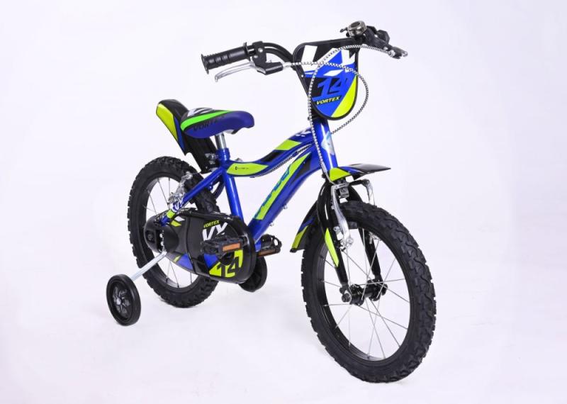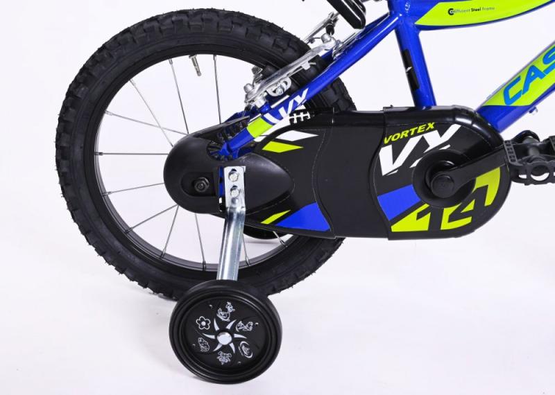 Dětské kolo Casadei Vortex 14 je nádherné chlapecké kolo typu BMX, které vykouzlí úsměv na tváři každého malého závodníka. Kolo má 14palcová nafukovací kola s kovovými ráfky a díky kvalitním plášťům s 3D vzorkem můžete vzít vaše kolo i do terénu. Kolo je určeno pro děti s výškou výškou postavy od 95 cm.Kolo má kvalitní ocelový rám typu BMX a nádherný lak, který okamžitě získá pozornost všech kolemjdoucích. Na řídítkách najdete ergonomické protiskluzové rukojeti, zvonek a dvě ruční páčkové brzdy, jejichž velikost je přizpůsobena pro malé dětské ruce. Pohodlné polstrované sedlo je výškově nastavitelné. Díky uzavřenému krytu řetězu si děti nezašpiní kalhoty a nehrozí zachycení oděvu do ozubeného kola.