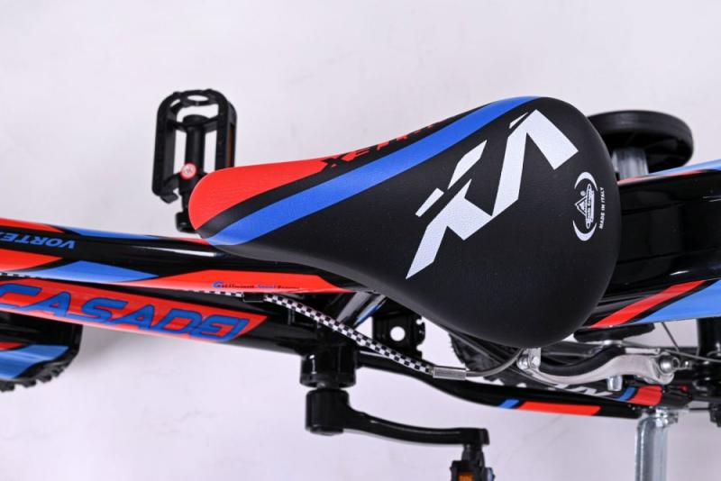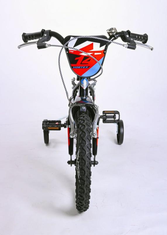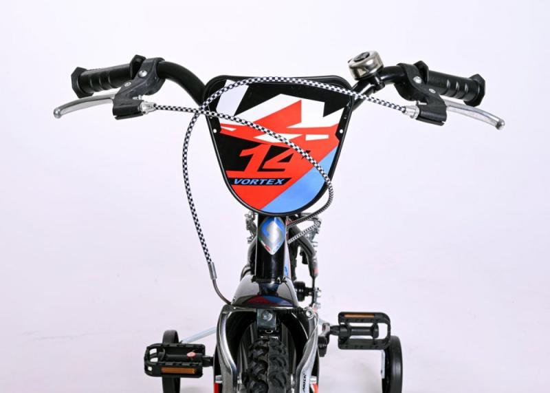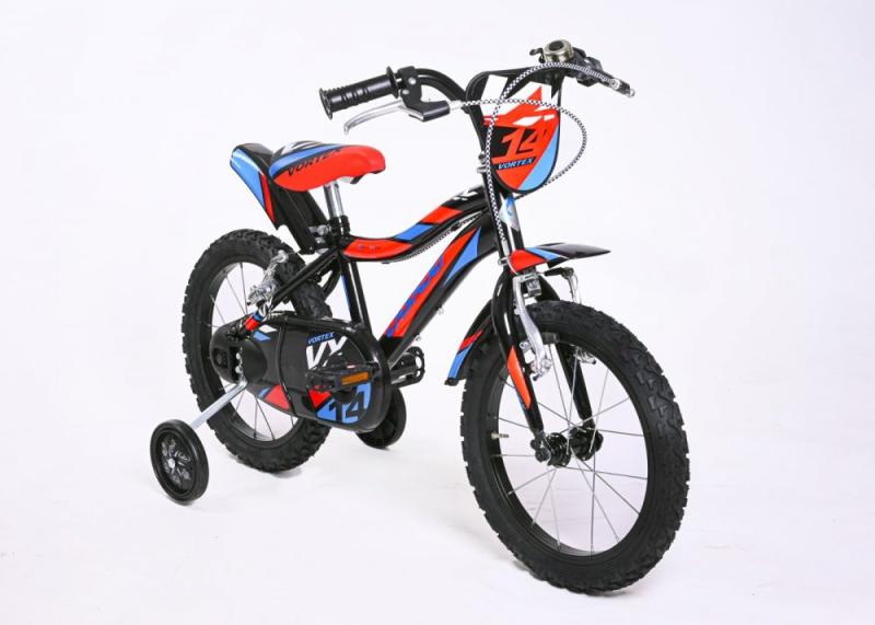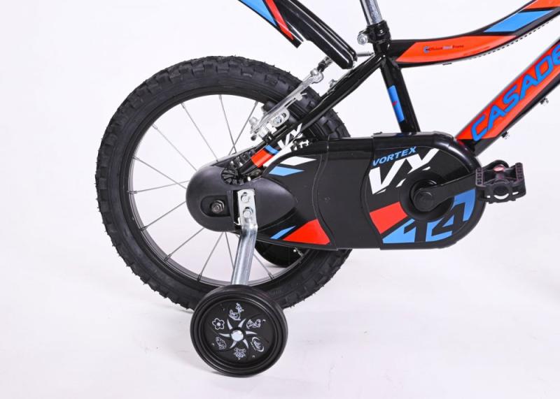 Dětské kolo Casadei Vortex 14 je nádherné chlapecké kolo typu BMX, které vykouzlí úsměv na tváři každého malého závodníka. Kolo má 14palcová nafukovací kola s kovovými ráfky a díky kvalitním plášťům s 3D vzorkem můžete vzít vaše kolo i do terénu. Kolo je určeno pro děti s výškou výškou postavy od 95 cm.Kolo má kvalitní ocelový rám typu BMX a nádherný lak, který okamžitě získá pozornost všech kolemjdoucích. Na řídítkách najdete ergonomické protiskluzové rukojeti, zvonek a dvě ruční páčkové brzdy, jejichž velikost je přizpůsobena pro malé dětské ruce. Pohodlné polstrované sedlo je výškově nastavitelné. Díky uzavřenému krytu řetězu si děti nezašpiní kalhoty a nehrozí zachycení oděvu do ozubeného kola.