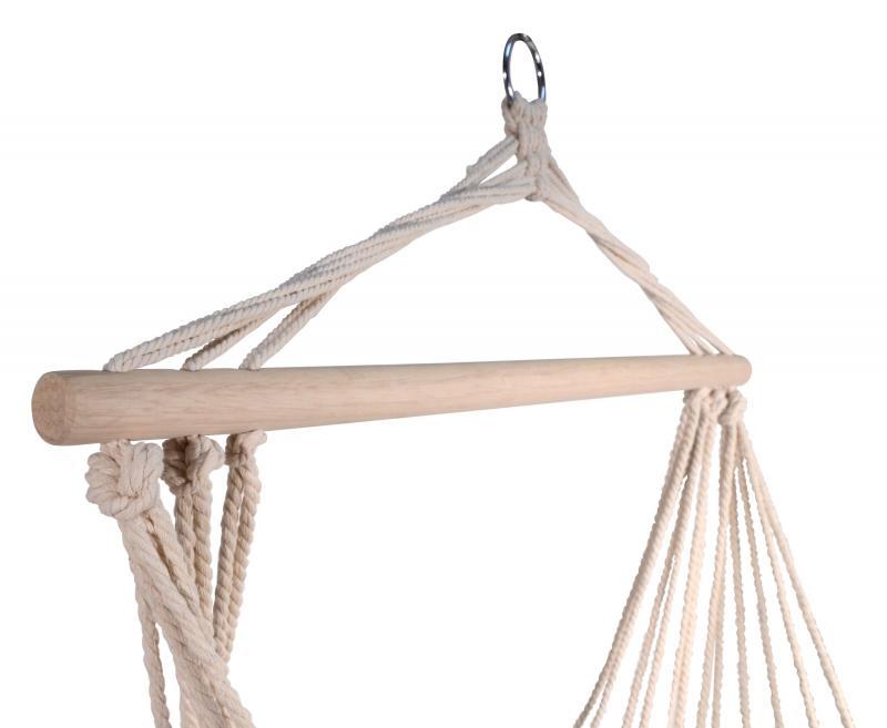 Outdoorová hojdacia sieť na sedenie, upevniteľná pomocou závesného krúžku.Siet je tvorená mäkkým polstrovaným sedákom o rozmeroch 50 x 45 cm a opierkou s výškou 50 cm. Vysokú mieru komfortu zabezpečuje práve polstrovanie o hrúbke 3 cm, doplnené hustotkaným, mäkkým a pružným vláknom jednotlivých povrazov.