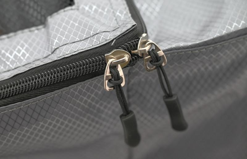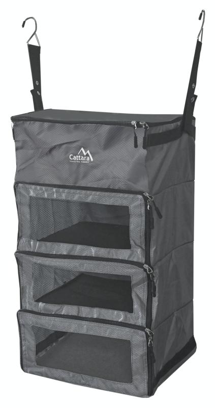 Organizér o rozměrech 35 x 30 x 60 cm je vybaven čtyřmi policemi se zavíráním na zip. Každá police má rozměr 35 x 30 x 15 cm a poskytuje dostatek prostoru pro oblečení, hygienické potřeby či drobné vybavení. Horní police je přístupná shora, ostatní police jsou doplněny síťovinou pro lepší přehlednost obsahu a jsou přístupné z přední strany.