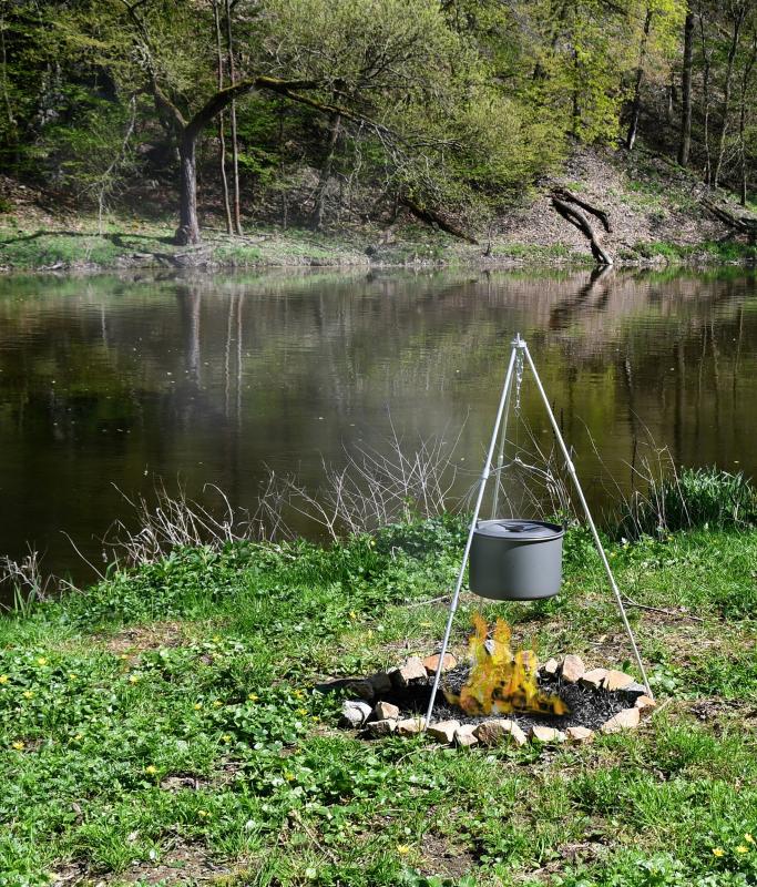Praktický skládací tripod je výtečným doplňkem pro plynový vařič, ale i ohniště.