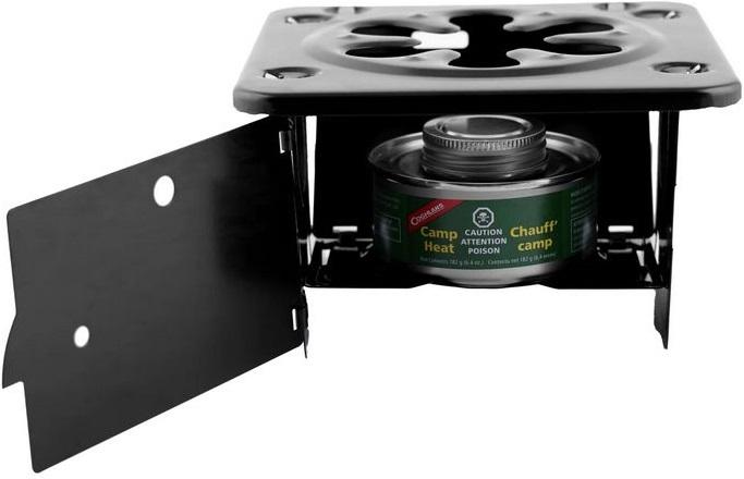 Skladací varič z potiahnutej ocele na pevné palivá so stabilnou varnou plošinou pre malý až stredne veľký hrniec alebo panvicu a prednými dvierkami a bočnými stranami poskytujúcimi ochranu pred vetrom Zobrazit celý popis