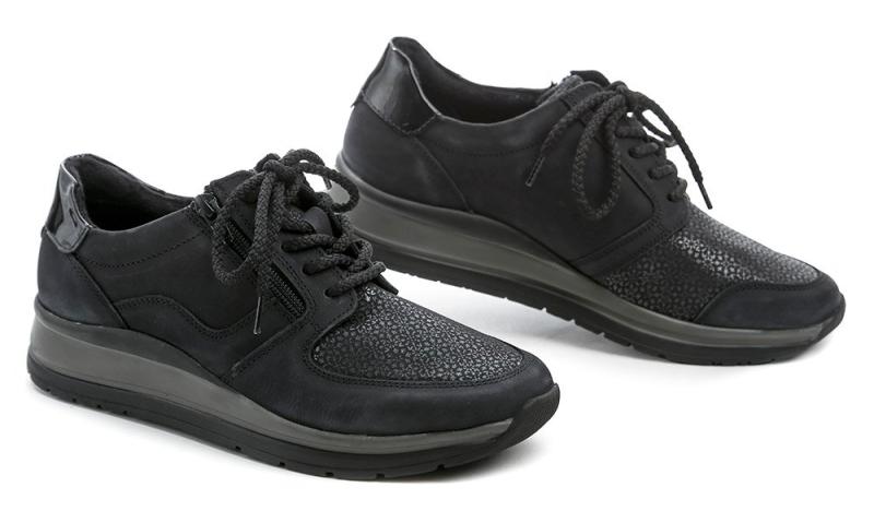 Celoročná zdravotná obuv na miernom klinovom podpätku so šnurovaním a zipsom, vhodná pre chodidlá s deformitami vďaka pružnému textilnému materiálu.