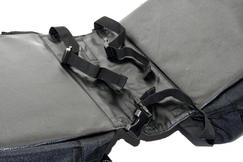 Spodní část je opatřena nastavitelnými přezkami, pro jednoduché upnutí u různých rozměrů nosičů.