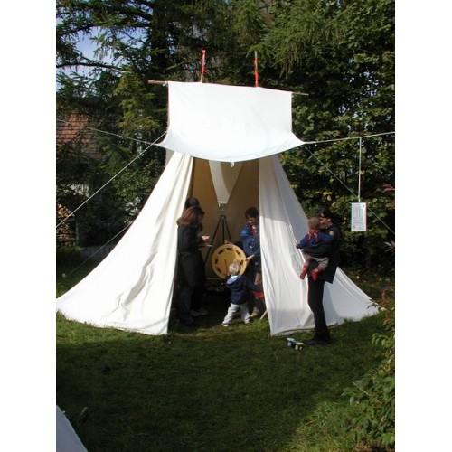 - Delší konce šňůr, které jste si nechali viset po stranách z vodorovné tyče se pak provlíknou očkama po stranách vrchlíku. Prvním okem například vpředu pak vodorovně k oku na zadní části vrchlíku a totéž na druhé straně. Zatáhnutím za tyto šňůry přiblížíte vrchlík ke stanu v době, kdy není potřeba odvádět kouř. Šnůru pak jen uvážete k některému z kolíků.
