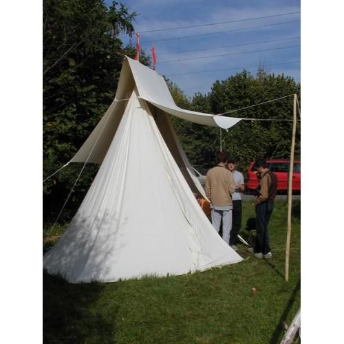 - Zvednete celé háčko a zatímco ho dva lidé drží vzpřímeně, další postupně kolíkuje stan po obvodu. Začínáme dvěma kolíky nejvíce vlevo a vpravo a postupně postupujeme dopředu a dozadu. Na vnějších půlkruzích je plachta přikolíkovaná přímo k zemi, ve střední rovné části roh lehce nedosáhne na zem a je třeba ho krajní poutko prodloužit pomocí provazu. Postupně budeme stan dovypínat a překolíkovávat, dokud nezíská ideální tvar. Dvě hlavní plachty se vpředu a vzadu poměrně velkou částí překrývají. Pokud je překrytí nedostatečné, je třeba lehce zvýšit úvaz plachet na tyči. Pokud je překrytí zbytečné velké, můžeme to tak nechat, ale stan bude o trochu menší, pokud chceme využít dostupný prostor, můžeme úvaz lehce snížit.
